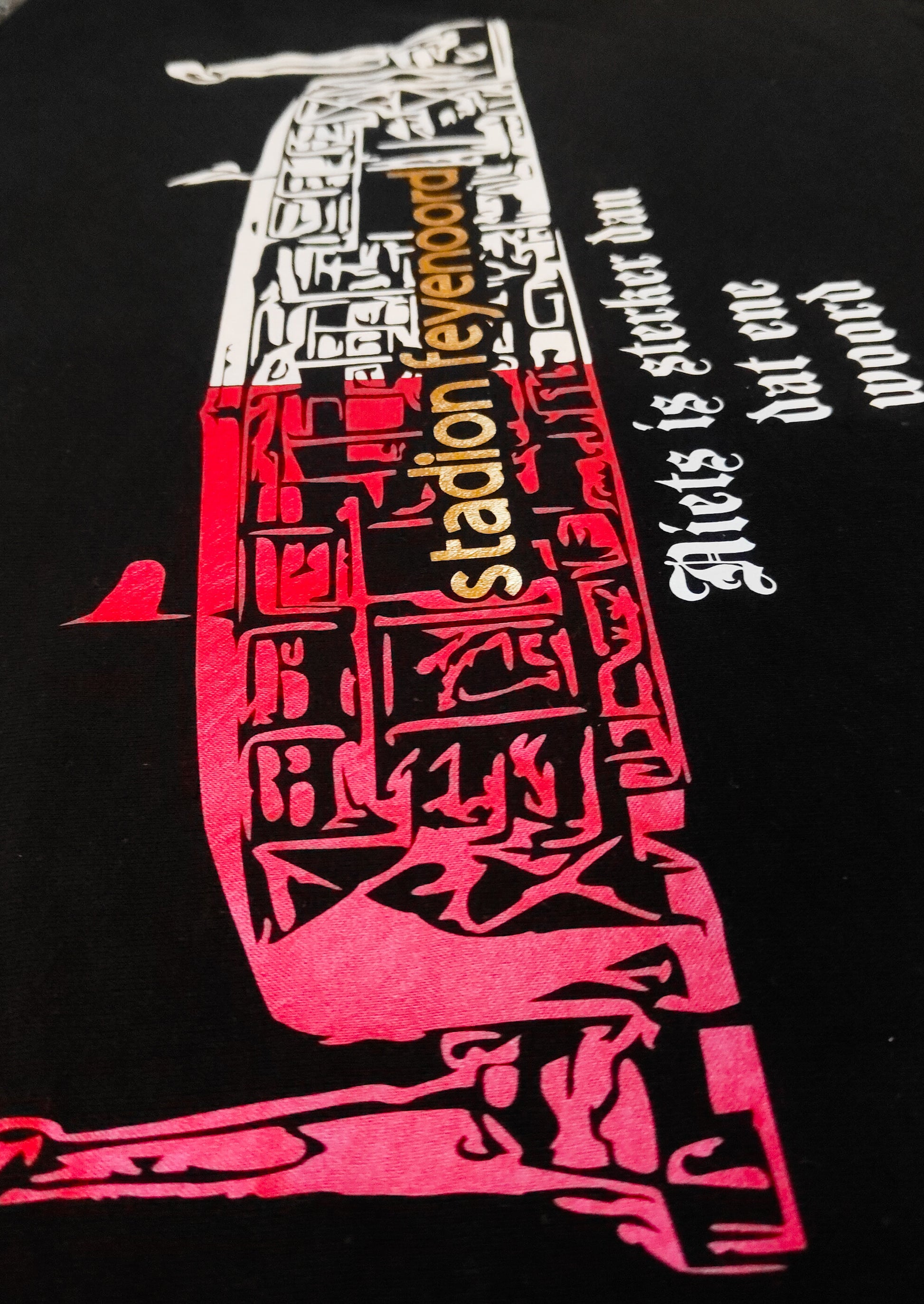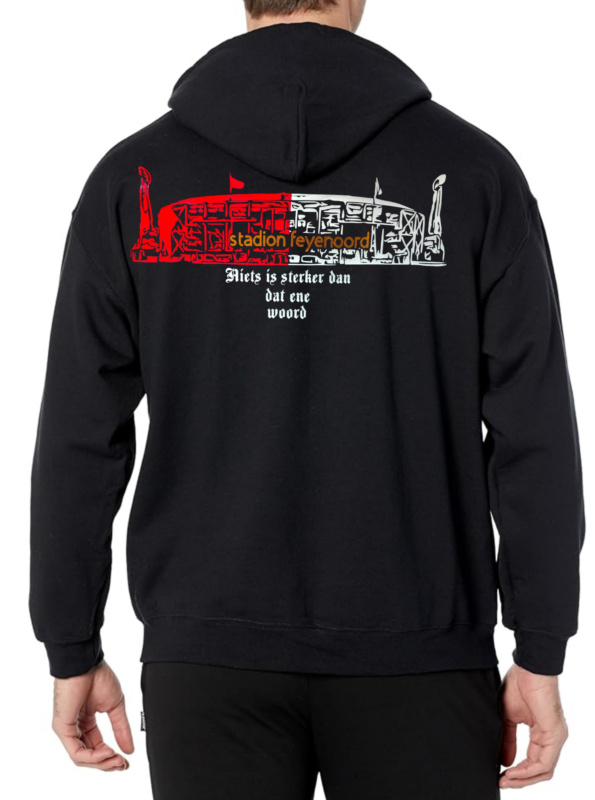 Een mooie zwarte hoodie met een warme voering. 50% katoen 50% polyester print van top kwaliteit vinyl.